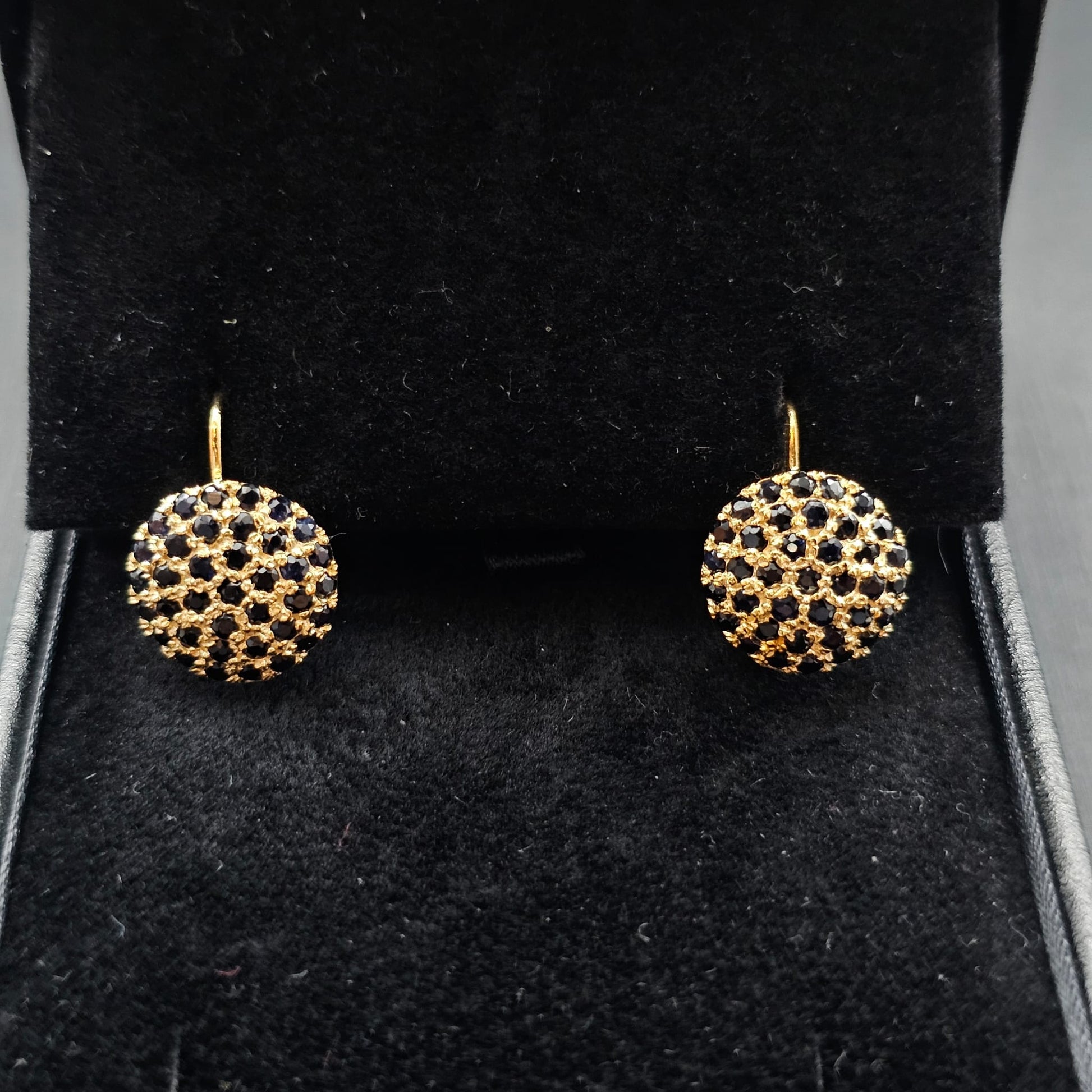 A bold and sophisticated jewel, these earrings in 9K yellow gold are set with natural black sapphires in a pavé arrangement, creating a refined contrast and an elegant modern look.